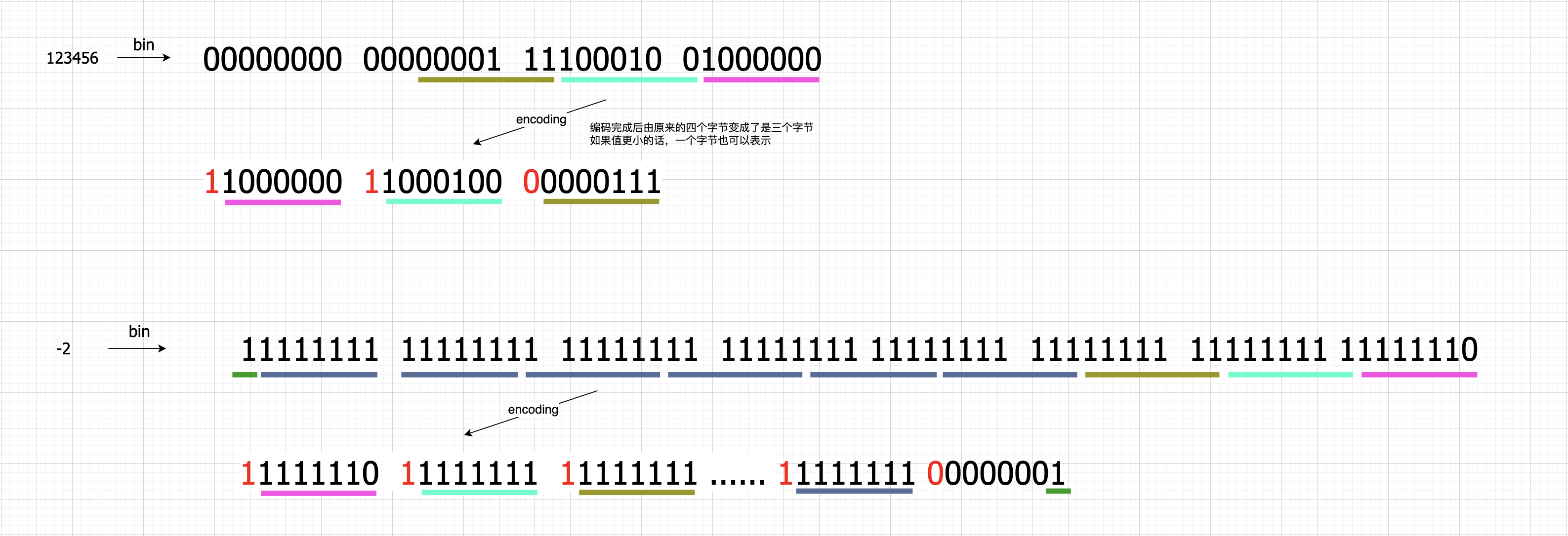 value process01 process02 final 2 \(00000010\) 0 \(00000000\) -2 \(11111110\space 11111111\space 11111111\space 11111111\space 11111111\space 11111111\space 11111111\space 11111111\space 11111111\space 00000001\) 123456 \(11000000\space11000100\space00000111\) ProtoBuf内置编解码 #