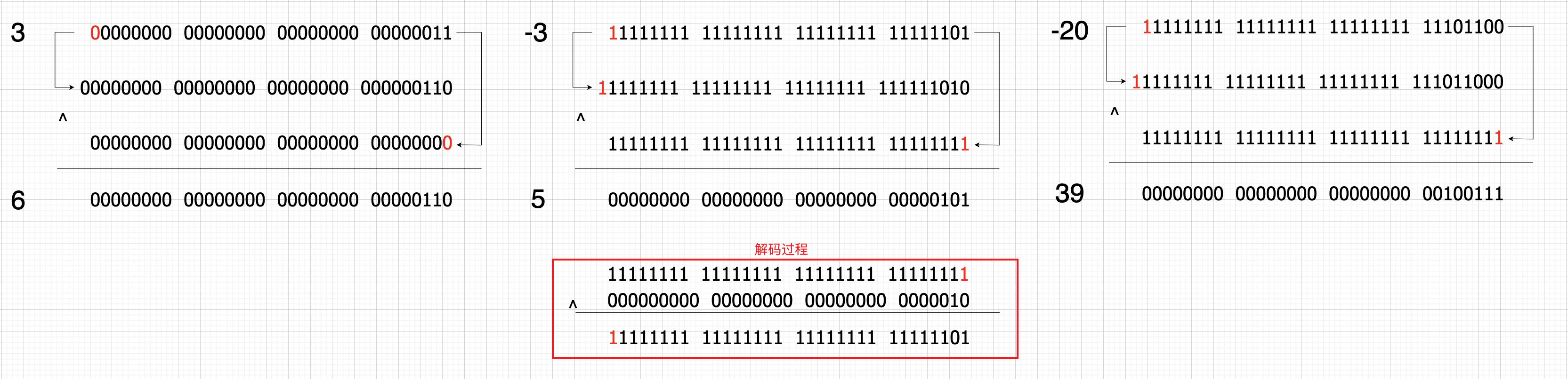需要注意的是:a).对于正数来说,左移相当于将 v 乘 2 了。因为后面的被异或的值全是 32 个 0,结合异或特性2,就是没有任何作用,所以只是单纯的 *2 了。对于负数说来,那就得慢慢说了。b).负数之所以会被压缩正是因为将负值多余的 1 与 32 个 1 进行异或后变成了可压缩的 0。c).编码后的值最低位保留的是符号位,正零负一。根据这个标志位才可以还原(解码)当前编码对应的实际值。d).解码过程逆向操作就行。举例演示 #