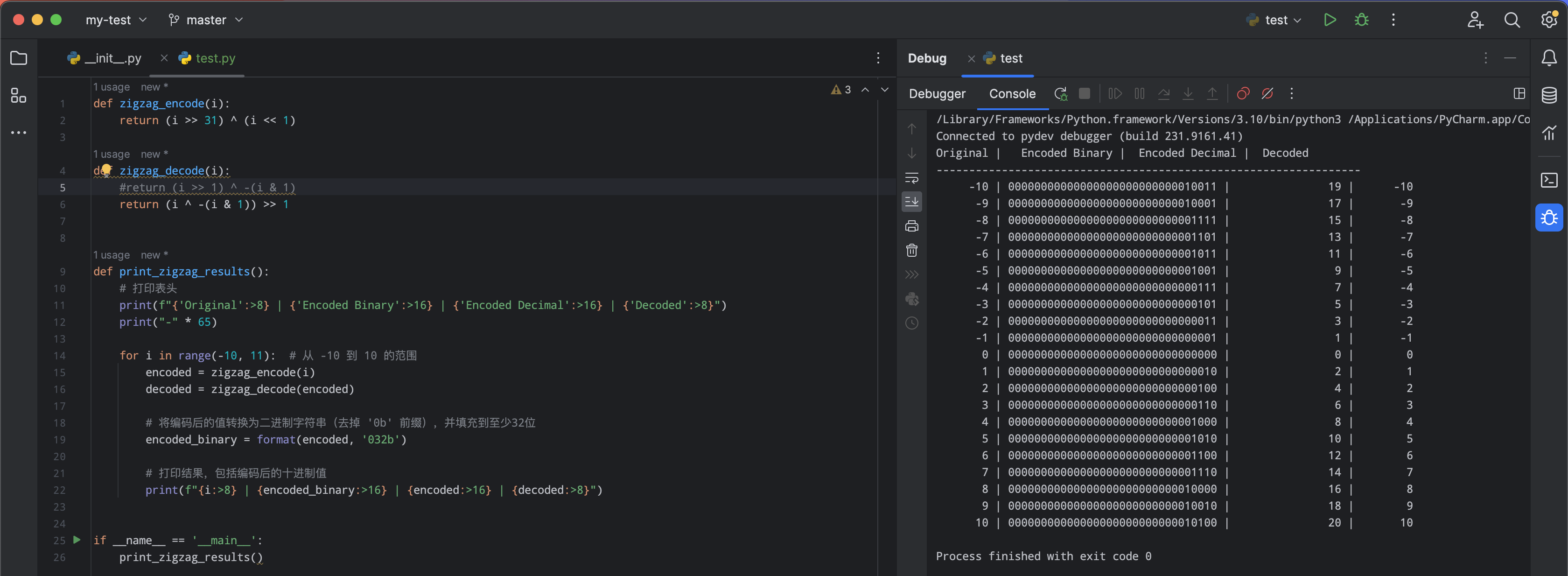 原始值 Bin(编码值) Dex(编码值) Dex(解码值) delimiter 原始值 Bin(编码值) Dex(编码值) Dex(解码值) -10 00000000000000000000000000010011 19 -10 0 00000000000000000000000000000000 0 0 -9 00000000000000000000000000010001 17 -9 1 00000000000000000000000000000010 2 1 -8 00000000000000000000000000001111 15 -8 2 00000000000000000000000000000100 4 2 -7 00000000000000000000000000001101 13 -7 3 00000000000000000000000000000110 6 3 -6 00000000000000000000000000001011 11 -6 4 00000000000000000000000000001000 8 4 -5 00000000000000000000000000001001 9 -5 5 00000000000000000000000000001010 10 5 -4 00000000000000000000000000000111 7 -4 6 00000000000000000000000000001100 12 6 -3 00000000000000000000000000000101 5 -3 7 00000000000000000000000000001110 14 7 -2 00000000000000000000000000000011 3 -2 8 00000000000000000000000000010000 16 8 -1 00000000000000000000000000000001 1 -1 9 00000000000000000000000000010010 18 9 python工具编解码 #