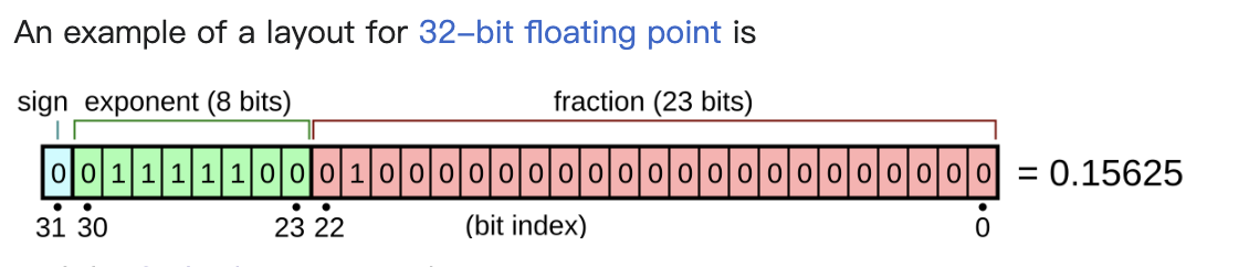 3.科学计数法规范化:\(1001.101 = 1.001101 * 2^3\)。4.由步骤 3 可知,exponent = 3。而 IEEE 754 单精度格式使用偏置值 127 来表示指数,所以加上偏置值 \(3 + 127 = 130 = 10000010\)5.组合起来就是: \(0\space 10000010_8\space 00110100000000000000000_{23}\)