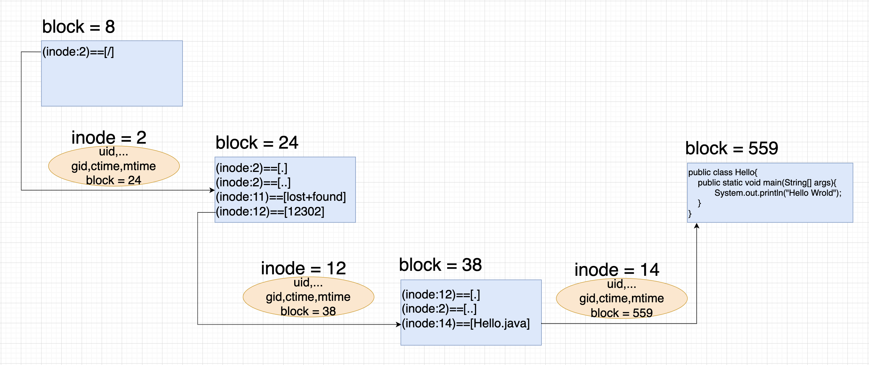 # 目录结构: root@12302:~# tree /mnt /mnt ├── 12302 │ └── Hello.java └── lost+found # 从根目录出发 / = inode = 2 # block = block[0] = 18 00 00 00 = 24 ➜ data git:(master) ✗ xxd -a -u -g1 -s `echo '1024 * 8 + 128' | bc` -l `echo '128' | bc` fs1m-with-data 00002080: ED 41 00 00 00 04 00 00 1B B0 0C 67 1A B0 0C 67 .A.........g...g 00002090: 1A B0 0C 67 00 00 00 00 00 00 04 00 02 00 00 00 ...g............ 000020a0: 00 00 00 00 01 00 00 00 18 00 00 00 00 00 00 00 ................ 000020b0: 00 00 00 00 00 00 00 00 00 00 00 00 00 00 00 00 ................ * 000020f0: 00 00 00 00 00 00 00 00 00 00 00 00 00 00 00 00 ................ # 查看 block = 24, 第 24 块里面的数据 # inode[4] = 0C 00 00 00 = 12 # rec_len[2] = D4 03 = 980 # name_len[1] = 05 = 5 # file_type[1] = 02 = 2 # name[0-255] = 31 32 33 30 32 ==> ascii [12302] ➜ data git:(master) ✗ xxd -a -u -g1 -s `echo '1024 * 24' | bc` -l `echo '1024' | bc` fs1m-with-data 00006000: 02 00 00 00 0C 00 01 02 2E 00 00 00 02 00 00 00 ................ 00006010: 0C 00 02 02 2E 2E 00 00 0B 00 00 00 14 00 0A 02 ................ 00006020: 6C 6F 73 74 2B 66 6F 75 6E 64 00 00 0C 00 00 00 lost+found...... 00006030: D4 03 05 02 31 32 33 30 32 00 00 00 00 00 00 00 ....12302....... 00006040: 00 00 00 00 00 00 00 00 00 00 00 00 00 00 00 00 ................ * 000063f0: 00 00 00 00 00 00 00 00 00 00 00 00 00 00 00 00 ................ # 继续查看目录 12302 = inode = 12 # 12302 的 block = block[0] = 26 00 00 00 = 38 ➜ data git:(master) ✗ xxd -a -u -g1 -s `echo '1024 * 8 + 128 * 11' | bc` -l `echo '128' | bc` fs1m-with-data 00002580: ED 41 00 00 00 04 00 00 7C B0 0C 67 7A B0 0C 67 .A......|..gz..g 00002590: 7A B0 0C 67 00 00 00 00 00 00 02 00 02 00 00 00 z..g............ 000025a0: 00 00 00 00 0A 00 00 00 26 00 00 00 00 00 00 00 ........&....... 000025b0: 00 00 00 00 00 00 00 00 00 00 00 00 00 00 00 00 ................ * 000025e0: 00 00 00 00 E3 A9 A0 96 00 00 00 00 00 00 00 00 ................ 000025f0: 00 00 00 00 00 00 00 00 00 00 00 00 00 00 00 00 ................ # 查看 block = 38, 第 38 块里面的数据 # 三个数据项[.|..|Hello.java] # inode[4] = 0E 00 00 00 = 14 # rec_len[2] = E8 03 = 1000 # name_len[1] = 0A = 10 # file_type[1] = 01 = 1 ,表示是一个文件 # name[0-255] = 48 65 6C 6C 6F 2E 6A 61 76 61 ==> ascii [Hello.java] ➜ data git:(master) ✗ xxd -a -u -g1 -s `echo '1024 * 38' | bc` -l `echo '1024' | bc` fs1m-with-data 00009800: 0C 00 00 00 0C 00 01 02 2E 00 00 00 02 00 00 00 ................ 00009810: 0C 00 02 02 2E 2E 00 00 0E 00 00 00 E8 03 0A 01 ................ 00009820: 48 65 6C 6C 6F 2E 6A 61 76 61 00 00 00 00 00 00 Hello.java...... 00009830: 00 00 00 00 00 00 00 00 00 00 00 00 00 00 00 00 ................ * 00009bf0: 00 00 00 00 00 00 00 00 00 00 00 00 00 00 00 00 ................ # 继续查看文件 Hello.java = inode = 14 # Hello.java 的 block = block[0] = 2F 02 00 00 = 559 ➜ data git:(master) ✗ xxd -a -u -g1 -s `echo '1024 * 8 + 128 * 13' | bc` -l `echo '128' | bc` fs1m-with-data 00002680: A4 81 00 00 6F 00 00 00 68 B0 0C 67 7A B0 0C 67 ....o...h..gz..g 00002690: 68 B0 0C 67 00 00 00 00 00 00 01 00 02 00 00 00 h..g............ 000026a0: 00 00 00 00 01 00 00 00 2F 02 00 00 00 00 00 00 ......../....... 000026b0: 00 00 00 00 00 00 00 00 00 00 00 00 00 00 00 00 ................ * 000026e0: 00 00 00 00 98 DB 7D D7 00 00 00 00 00 00 00 00 ......}......... 000026f0: 00 00 00 00 00 00 00 00 00 00 00 00 00 00 00 00 ................ # 查看 block = 559, 第 559 块里面的数据 ➜ data git:(master) ✗ xxd -a -u -g1 -s `echo '1024 * 559' | bc` -l `echo '1024' | bc` fs1m-with-data 0008bc00: 70 75 62 6C 69 63 20 63 6C 61 73 73 20 48 65 6C public class Hel 0008bc10: 6C 6F 7B 0A 20 20 20 20 70 75 62 6C 69 63 20 73 lo{. public s 0008bc20: 74 61 74 69 63 20 76 6F 69 64 20 6D 61 69 6E 28 tatic void main( 0008bc30: 53 74 72 69 6E 67 5B 5D 20 61 72 67 73 29 7B 0A String[] args){. 0008bc40: 09 20 20 20 53 79 73 74 65 6D 2E 6F 75 74 2E 70 . System.out.p 0008bc50: 72 69 6E 74 6C 6E 28 22 48 65 6C 6C 6F 20 57 72 rintln("Hello Wr 0008bc60: 6F 6C 64 22 29 3B 0A 20 20 20 20 7D 0A 7D 0A 00 old");. }.}.. 0008bc70: 00 00 00 00 00 00 00 00 00 00 00 00 00 00 00 00 ................ * 0008bff0: 00 00 00 00 00 00 00 00 00 00 00 00 00 00 00 00 ................示例结构图如下