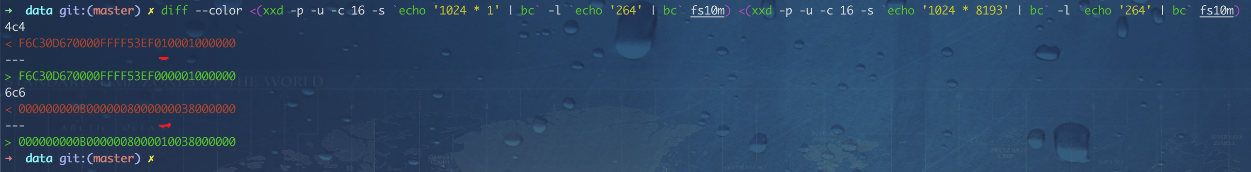 所以除了这两个块组的自身属性外,可以认为是完全复制。# 查看 (Block Group 0)super block # ➜ data git:(master) ✗ xxd -u -g1 -s `echo '1024 * 1' | bc` -l `echo '264' | bc` fs10m 00000400: 00 0A 00 00 00 28 00 00 00 02 00 00 5B 26 00 00 .....(......[&.. 00000410: F5 09 00 00 01 00 00 00 00 00 00 00 00 00 00 00 ................ 00000420: 00 20 00 00 00 20 00 00 00 05 00 00 00 00 00 00 . ... .......... 00000430: F6 C3 0D 67 00 00 FF FF 53 EF 01 00 01 00 00 00 ...g....S....... 00000440: F6 C3 0D 67 00 00 00 00 00 00 00 00 01 00 00 00 ...g............ 00000450: 00 00 00 00 0B 00 00 00 80 00 00 00 38 00 00 00 ............8... 00000460: 02 00 00 00 03 00 00 00 C8 CC 95 B3 98 60 40 B5 .............`@. 00000470: A3 AC 66 22 AC 81 23 B2 00 00 00 00 00 00 00 00 ..f"..#......... 00000480: 00 00 00 00 00 00 00 00 00 00 00 00 00 00 00 00 ................ 00000490: 00 00 00 00 00 00 00 00 00 00 00 00 00 00 00 00 ................ 000004a0: 00 00 00 00 00 00 00 00 00 00 00 00 00 00 00 00 ................ 000004b0: 00 00 00 00 00 00 00 00 00 00 00 00 00 00 00 00 ................ 000004c0: 00 00 00 00 00 00 00 00 00 00 00 00 00 00 27 00 ..............'. 000004d0: 00 00 00 00 00 00 00 00 00 00 00 00 00 00 00 00 ................ 000004e0: 00 00 00 00 00 00 00 00 00 00 00 00 C8 7F C3 0C ................ 000004f0: 07 50 46 64 86 E5 1F F8 EC C1 C7 9F 01 00 00 00 .PFd............ 00000500: 0C 00 00 00 00 00 00 00 ........# 查看 (Block Group 1)super block # ➜ data git:(master) ✗ xxd -u -g1 -s `echo '1024 * 8193' | bc` -l `echo '264' | bc` fs10m 00800400: 00 0A 00 00 00 28 00 00 00 02 00 00 5B 26 00 00 .....(......[&.. 00800410: F5 09 00 00 01 00 00 00 00 00 00 00 00 00 00 00 ................ 00800420: 00 20 00 00 00 20 00 00 00 05 00 00 00 00 00 00 . ... .......... 00800430: F6 C3 0D 67 00 00 FF FF 53 EF 00 00 01 00 00 00 ...g....S....... 00800440: F6 C3 0D 67 00 00 00 00 00 00 00 00 01 00 00 00 ...g............ 00800450: 00 00 00 00 0B 00 00 00 80 00 01 00 38 00 00 00 ............8... 00800460: 02 00 00 00 03 00 00 00 C8 CC 95 B3 98 60 40 B5 .............`@. 00800470: A3 AC 66 22 AC 81 23 B2 00 00 00 00 00 00 00 00 ..f"..#......... 00800480: 00 00 00 00 00 00 00 00 00 00 00 00 00 00 00 00 ................ 00800490: 00 00 00 00 00 00 00 00 00 00 00 00 00 00 00 00 ................ 008004a0: 00 00 00 00 00 00 00 00 00 00 00 00 00 00 00 00 ................ 008004b0: 00 00 00 00 00 00 00 00 00 00 00 00 00 00 00 00 ................ 008004c0: 00 00 00 00 00 00 00 00 00 00 00 00 00 00 27 00 ..............'. 008004d0: 00 00 00 00 00 00 00 00 00 00 00 00 00 00 00 00 ................ 008004e0: 00 00 00 00 00 00 00 00 00 00 00 00 C8 7F C3 0C ................ 008004f0: 07 50 46 64 86 E5 1F F8 EC C1 C7 9F 01 00 00 00 .PFd............ 00800500: 0C 00 00 00 00 00 00 00 ........