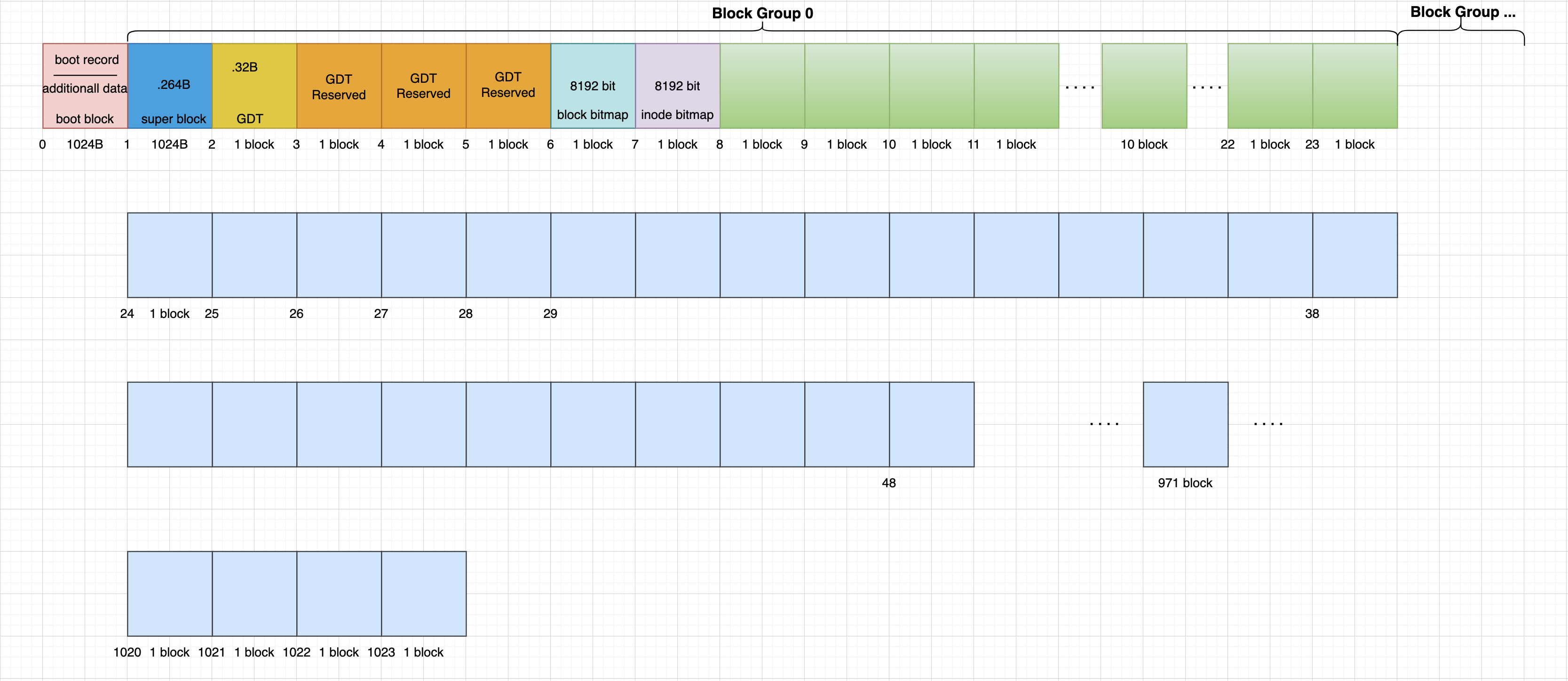 因为如果使用 block = 1024B 划分的话,每个块组最多可以包含块为 (block bitmap = 1024 * 8 = 8192) 个块。所以我们需要放大文件系统容量,这次采用 10M 的,还是按照 block = 1024B 进行划分,(10M / 1024B = 10240 块 > 8192)则会产生第二个 Block Group。