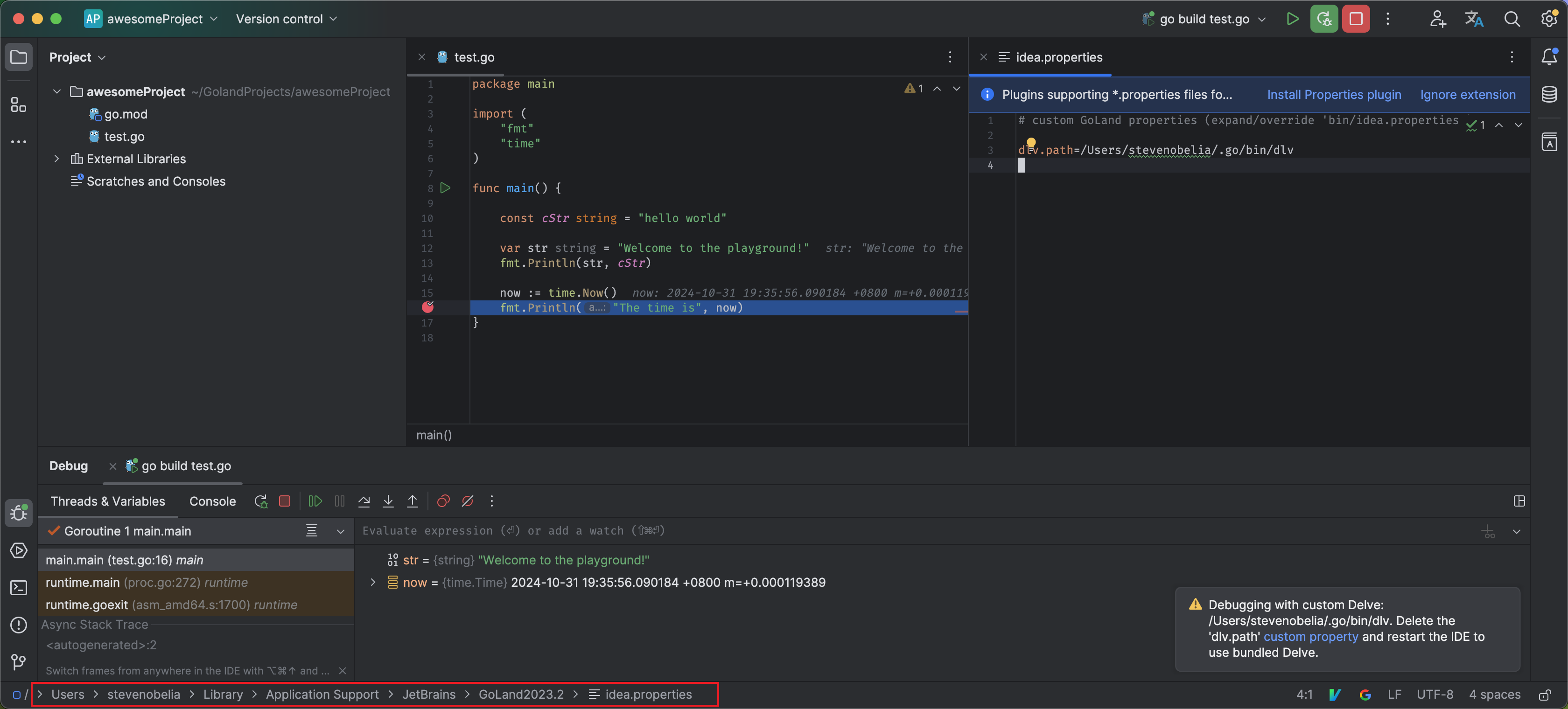 Set thedlv.path=<path_to_dlv_executable>under Help > Edit Custom Properties, 比如:dlv.path=/Users/stevenobelia/.go/bin/dlv