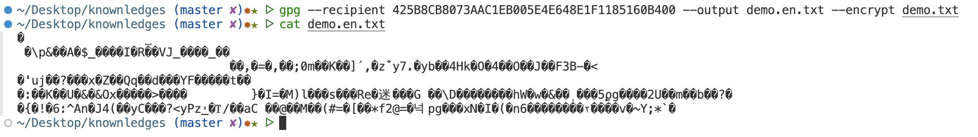gpg --recipient 425B8CB8073AAC1EB005E4E648E1F1185160B400 --output demo.en.txt --encrypt demo.txt