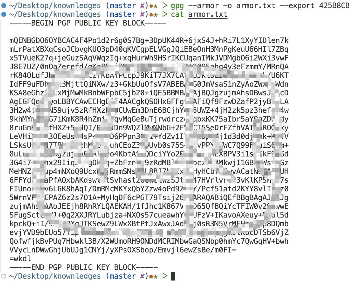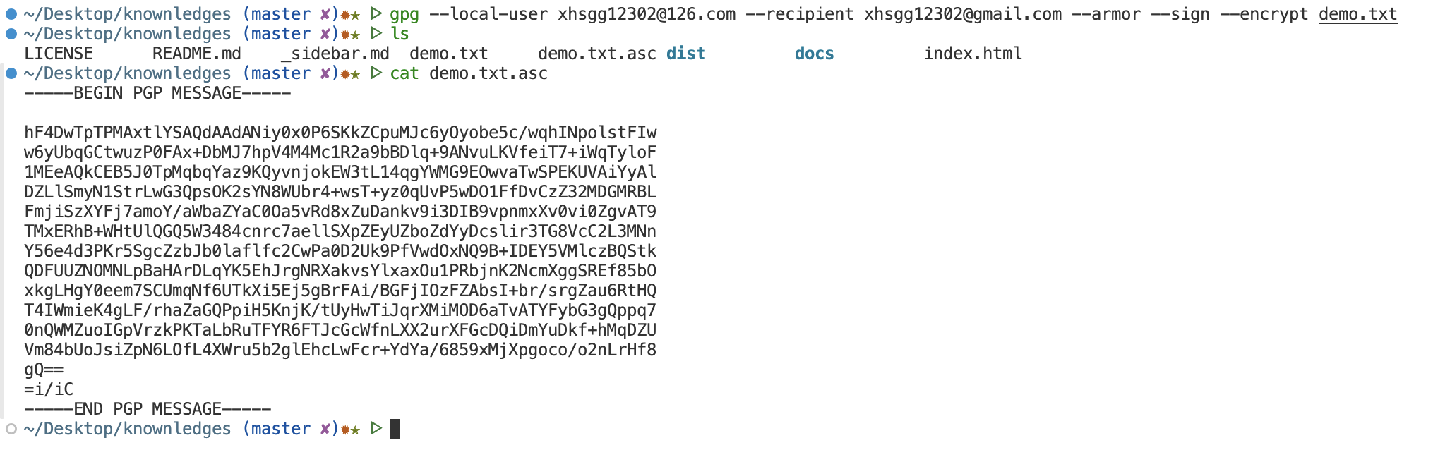 local-user参数指定用发信者的私钥签名,recipient参数指定用接收者的公钥加密,armor参数表示采用ASCII码形式显示,
