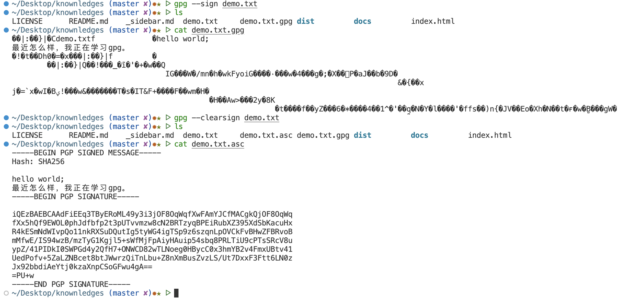 生成 demo.txt.gpg 文件,这个文件默认采用二进制储存,如果想生成ASCII码的签名文件,可以使用--clearsign参数,生成 demo.txt.asc 文件