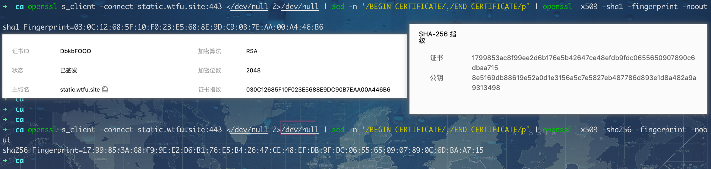 另外可以计算 sha-256 指纹(对应 chrome 浏览器证书基本信息中的值),包括 证书和公匙
