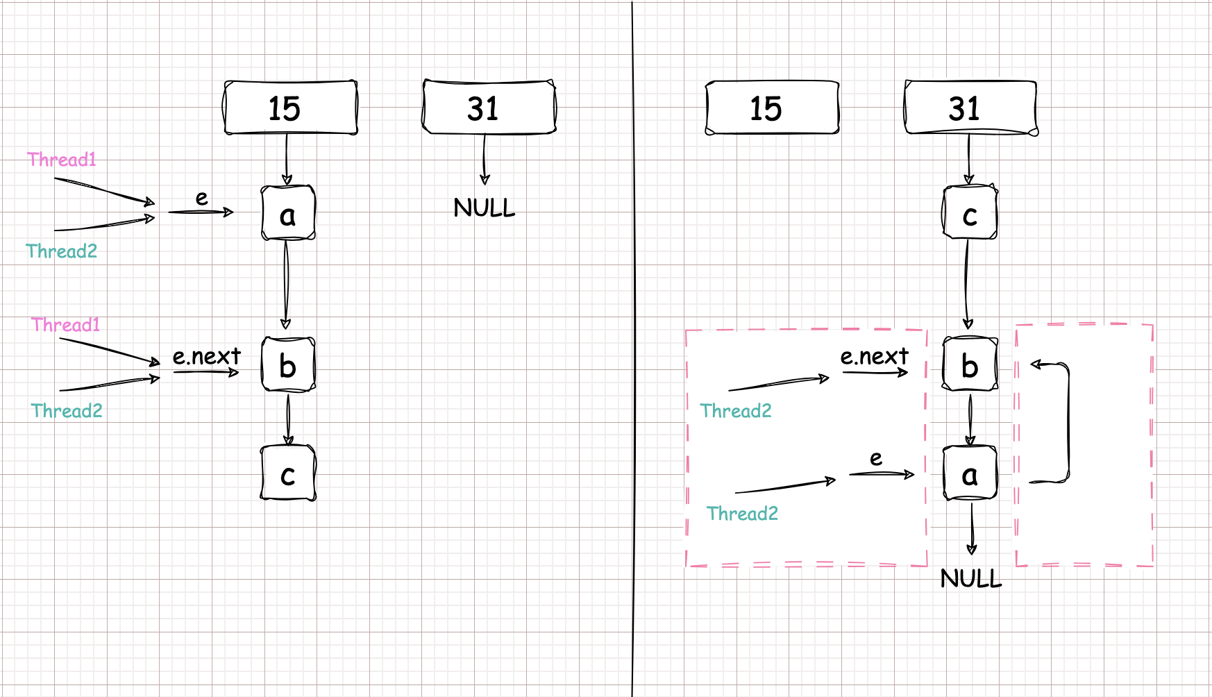 而线程2开始执行的时候发现,\(e \to a, e.next \to b\) 。结合 e, e.next 的语义可以发现:此时右边所示左右两个红框所表达的是一个意思也就是 \(a \to b\)。