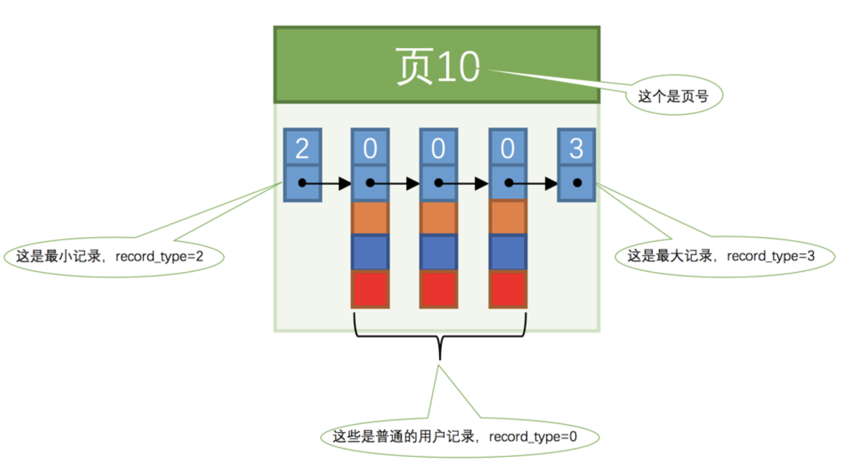 我们前边说过一个B+树只需要很少的层级就可以轻松存储数亿条记录,查询速度杠杠的!这是因为B+树本质上就是一个大的多层级目录,每经过一个目录时都会过滤掉许多无效的子目录,直到最后访问到存储真实数据的目录。那如果一个大的目录中只存放一个子目录是个啥效果呢?那就是目录层级非常非常非常多,而且最后的那个存放真实数据的目录中只能存放一条记录。费了半天劲只能存放一条真实的用户记录?逗我呢?所以 InnoDB 的一个数据页至少可以存放两条记录,这也是我们之前唠叨记录行格式的时候说过一个结论(我们当时依据这个结论推导了表中只有一个列时该列在不发生行溢出的情况下最多能存储多少字节,忘了的话回去看看吧)。