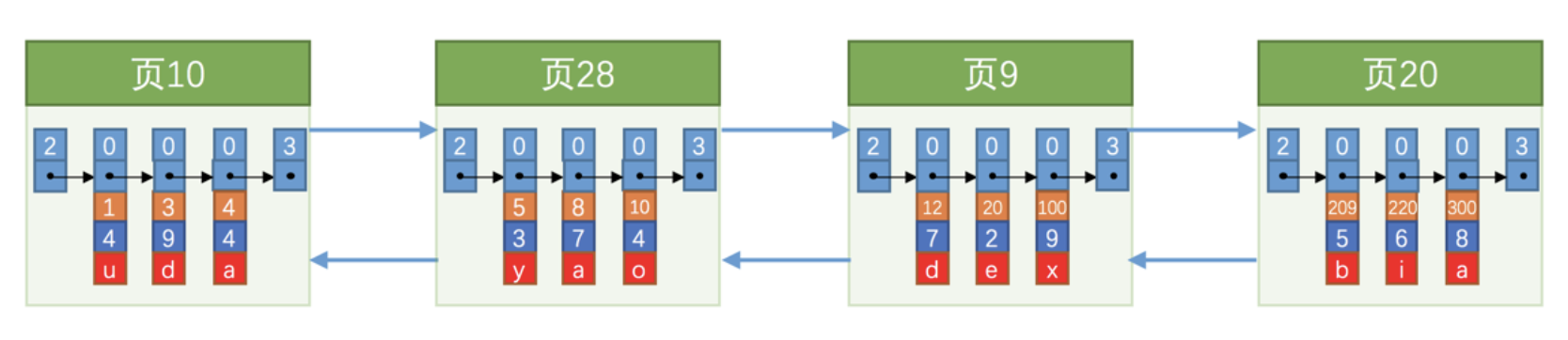 其中页a、页b、页c … 页n 这些页可以不在物理结构上相连,只要通过双向链表相关联即可。