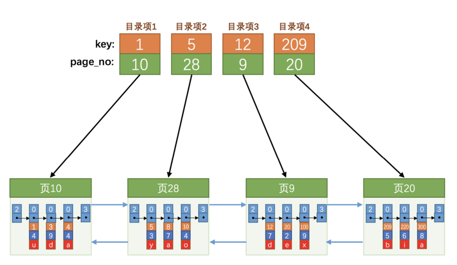 因为这些 16KB 的页在物理存储上可能并不挨着,所以如果想从这么多页中根据主键值快速定位某些记录所在的页,我们需要给它们做个目录,每个页对应一个目录项,每个目录项包括下边两个部分: