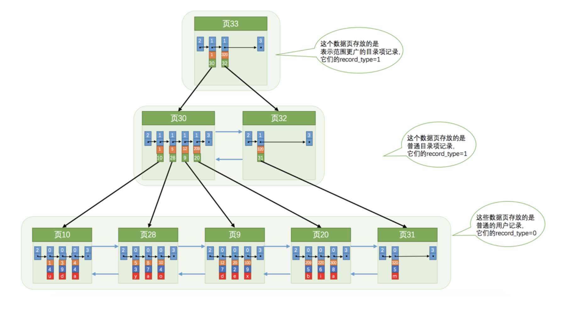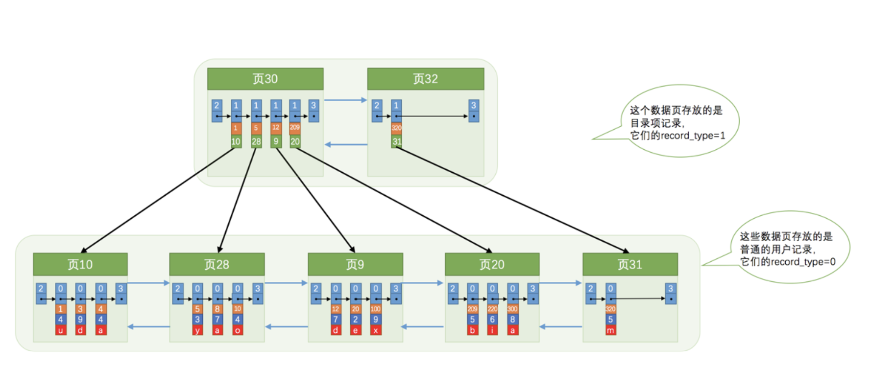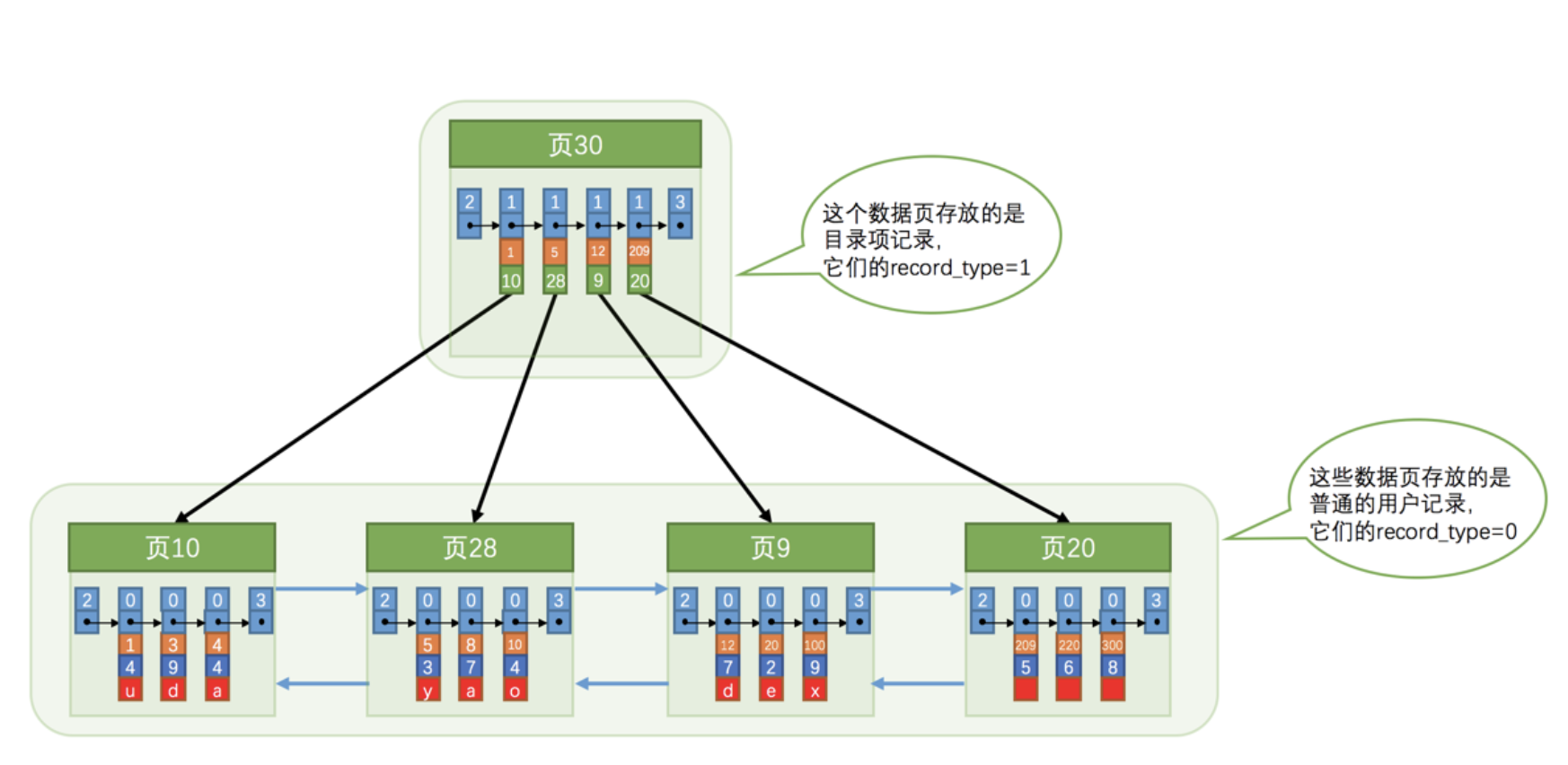 从图中可以看出来,我们新分配了一个编号为 30 的页来专门存储 目录项记录 。这里再次强调一遍 目录项记录和普通的 用户记录 的不同点: