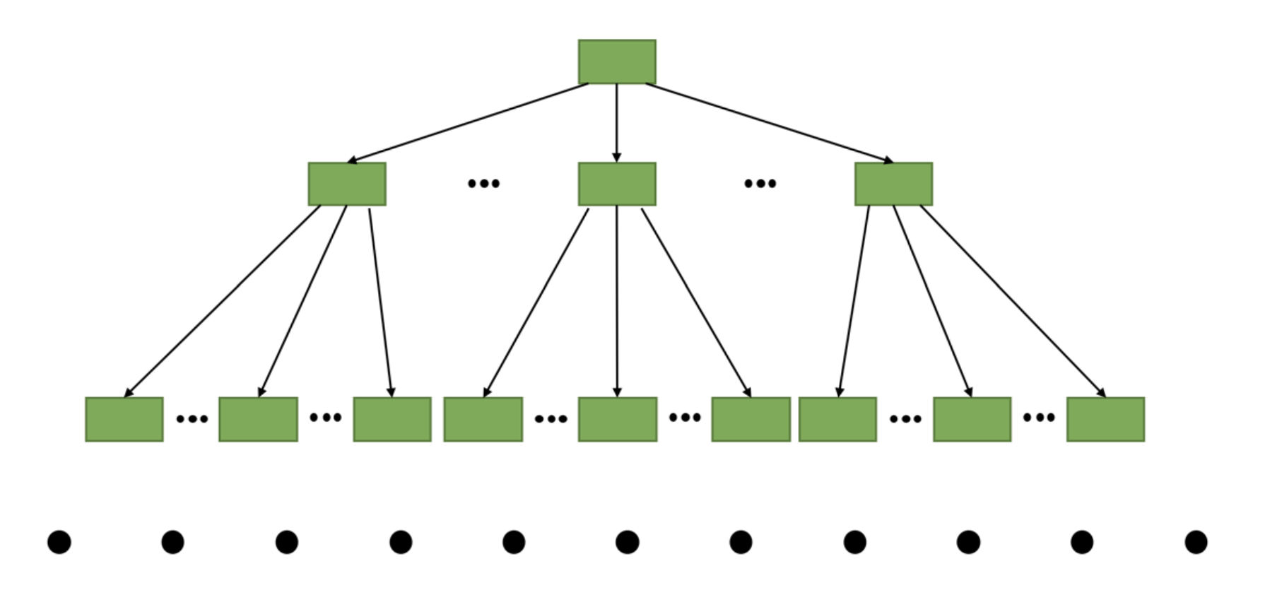 如图,我们生成了一个存储更高级目录项的 页33 ,这个页中的两条记录分别代表 页30 和 页32 ,如果用户记录的主键值在 [1, 320) 之间,则到 页30 中查找更详细的 目录项记录 ,如果主键值不小于 320 的话,就到 页32中查找更详细的 目录项记录 。不过这张图好漂亮喔,随着表中记录的增加,这个目录的层级会继续增加,如果简化一下,那么我们可以用下边这个图来描述它: