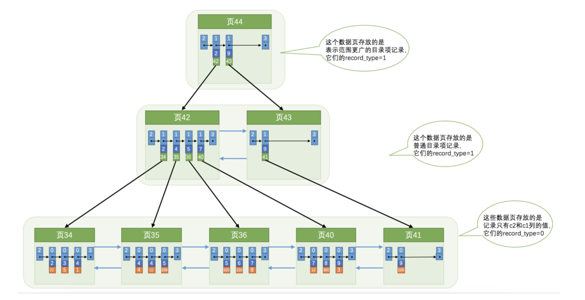 1).使用记录 c2 列的大小进行记录和页的排序,这包括三个方面的含义:1.1).页内的记录是按照 c2 列的大小顺序排成一个单向链表。1.2).各个存放用户记录的页也是根据页中记录的 c2 列大小顺序排成一个双向链表。1.3).存放目录项记录的页分为不同的层次,在同一层次中的页也是根据页中目录项记录的 c2 列大小顺序排成一个双向链表。2).B+ 树的叶子节点存储的并不是完整的用户记录,而只是 c2列+主键 这两个列的值。3).目录项记录中不再是 主键+页号 的搭配,而变成了 c2列+页号 的搭配。所以如果我们现在想通过 c2 列的值查找某些记录的话就可以使用我们刚刚建好的这个 B+ 树了。以查找 c2 列的值为 4 的记录为例,查找过程如下:3.1).确定目录项记录页根据根页面,也就是页44,可以快速定位到目录项记录所在的页为页42(因为 2 < 4 < 9 )。3.2).通过目录项记录页确定用户记录真实所在的页在 页42 中可以快速定位到实际存储用户记录的页,但是由于 c2 列并没有唯一性约束,所以 c2 列值为 4 的记录可能分布在多个数据页中,又因为 2 < 4 ≤ 4 ,所以确定实际存储用户记录的页在 页34 和 页35 中。3.3).在真实存储用户记录的页中定位到具体的记录到 页34 和 页35 中定位到具体的记录。3.4).但是这个 B+ 树的叶子节点中的记录只存储了 c2 和 c1 (也就是 主键 )两个列,所以我们必须再根据主键值去聚簇索引中再查找一遍完整的用户记录。各位各位,看到步骤4的操作了么?我们根据这个以 c2 列大小排序的 B+ 树只能确定我们要查找记录的主键值,所以如果我们想根据 c2 列的值查找到完整的用户记录的话,仍然需要到 聚簇索引 中再查一遍,这个过程也被称为回表。也就是根据 c2 列的值查询一条完整的用户记录需要使用到 2 棵 B+ 树!!!