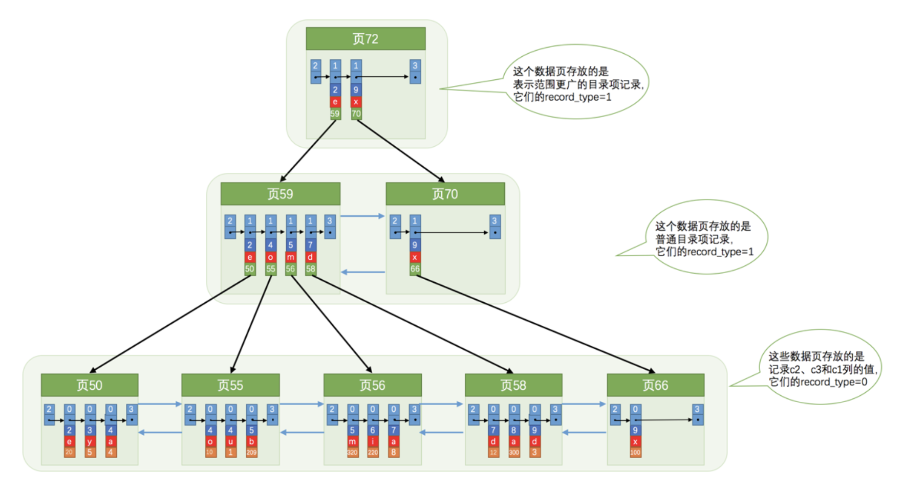a).每条 目录项记录 都由 c2 、 c3 、 页号 这三个部分组成,各条记录先按照 c2 列的值进行排序,如果记录的 c2 列相同,则按照 c3 列的值进行排序。b).B+ 树叶子节点处的用户记录由 c2 、 c3 和主键 c1 列组成。