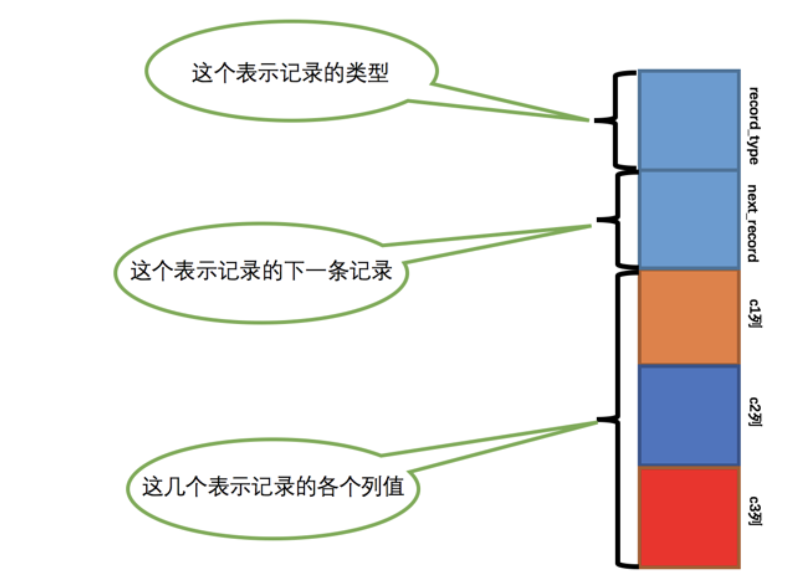 1).record_type:记录头信息的一项属性,表示记录的类型,0 表示普通记录、2 表示最小记录、3 表示最大记录、1 我们还没用过,等会再说~2).next_record:记录头信息的一项属性,表示下一条地址相对于本条记录的地址偏移量,为了方便大家理解,我们都会用箭头来表明下一条记录是谁。3).各个列的值:这里只记录在 index_demo 表中的三个列,分别是 c1 、 c2 和 c3 。4).其他信息:除了上述3种信息以外的所有信息,包括其他隐藏列的值以及记录的额外信息。