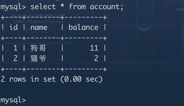 狗哥和猫爷是一对好基友,他们都到银行开一个账户,他们在现实世界中拥有的资产就会体现在数据库世界的 account 表中。比如现在狗哥有 11 元,猫爷只有 2 元,那么现实中的这个情况映射到数据库的 account 表就是这样: