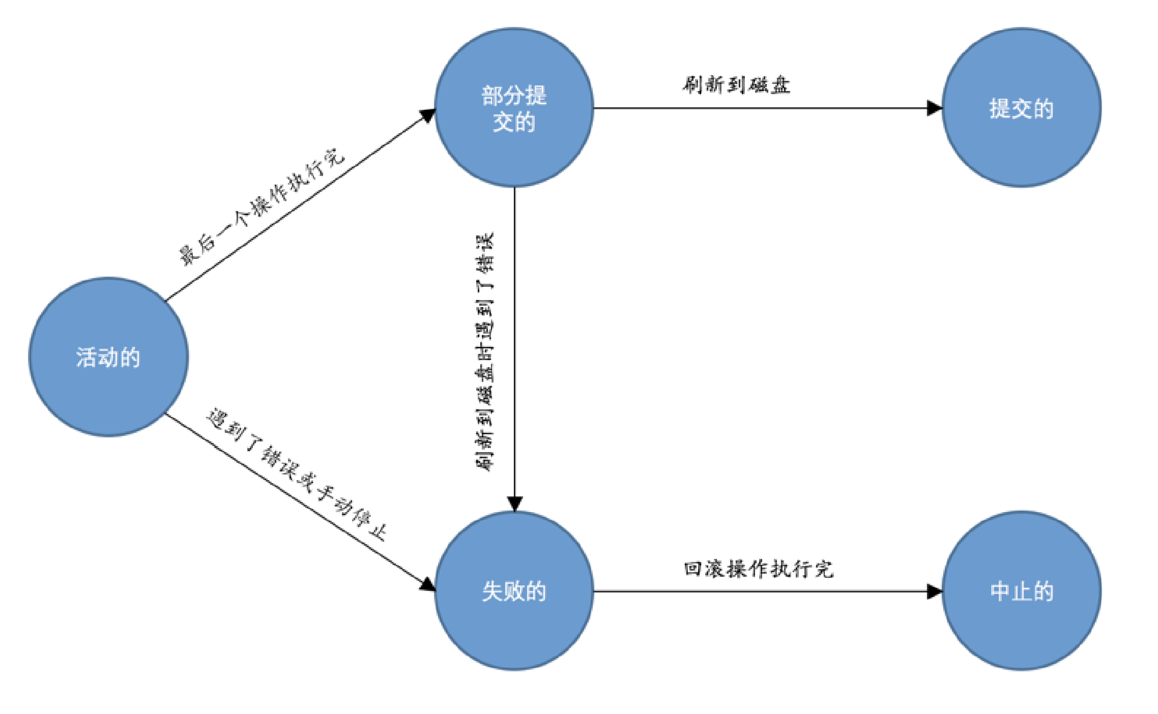 随着事务对应的数据库操作执行到不同阶段,事务的状态也在不断变化,一个基本的状态转换图如下所示: