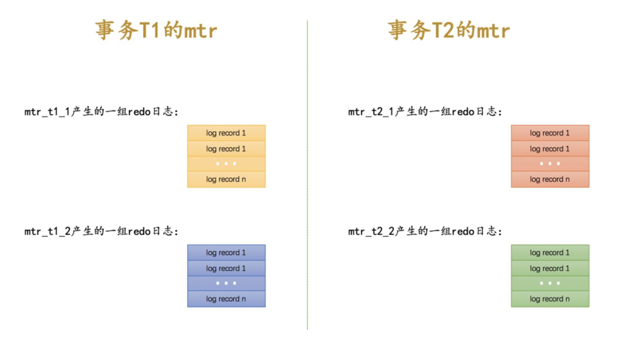 - 事务 T1 的两个 mtr 分别称为 mtr_T1_1 和 mtr_T1_2 。