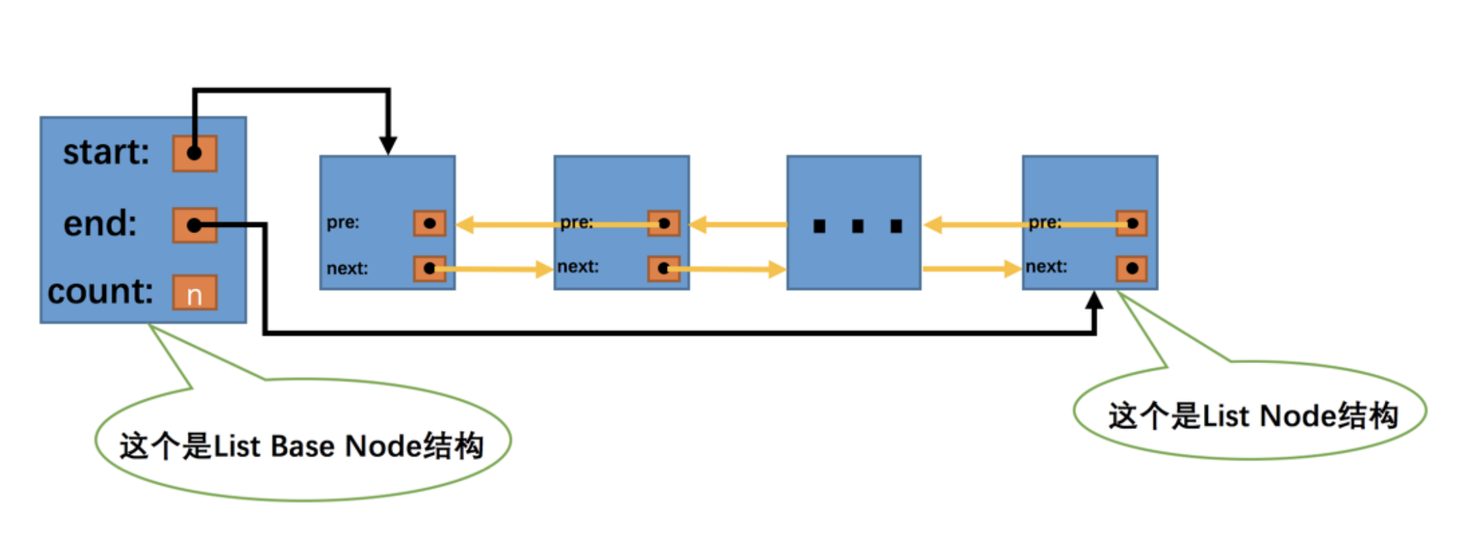 所以使用 List Base Node 和 List Node 这两个结构组成的链表的示意图就是这样: