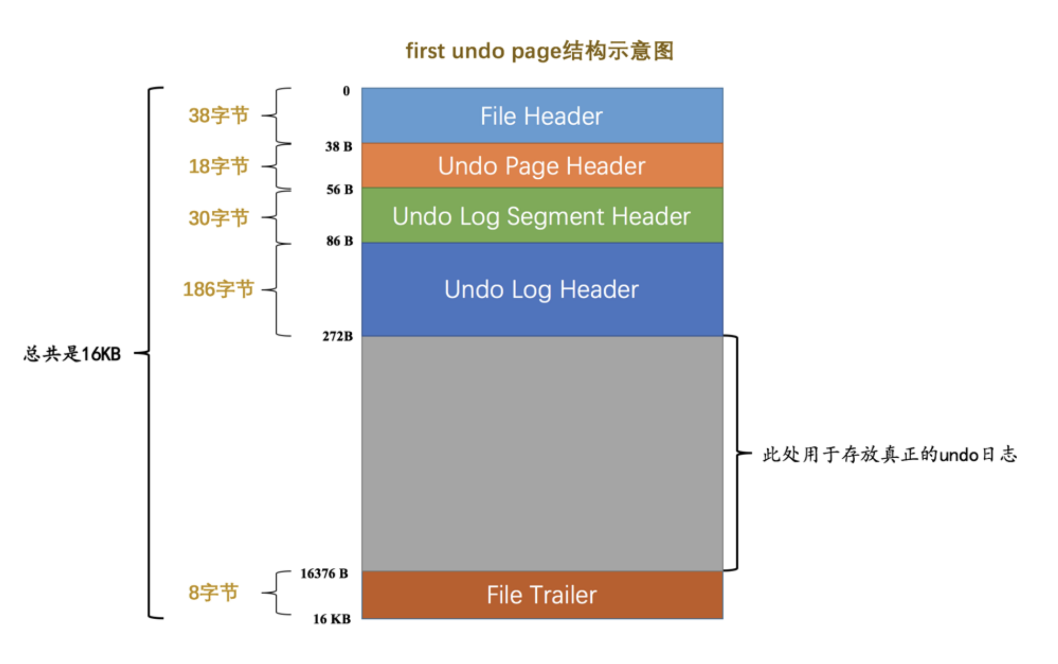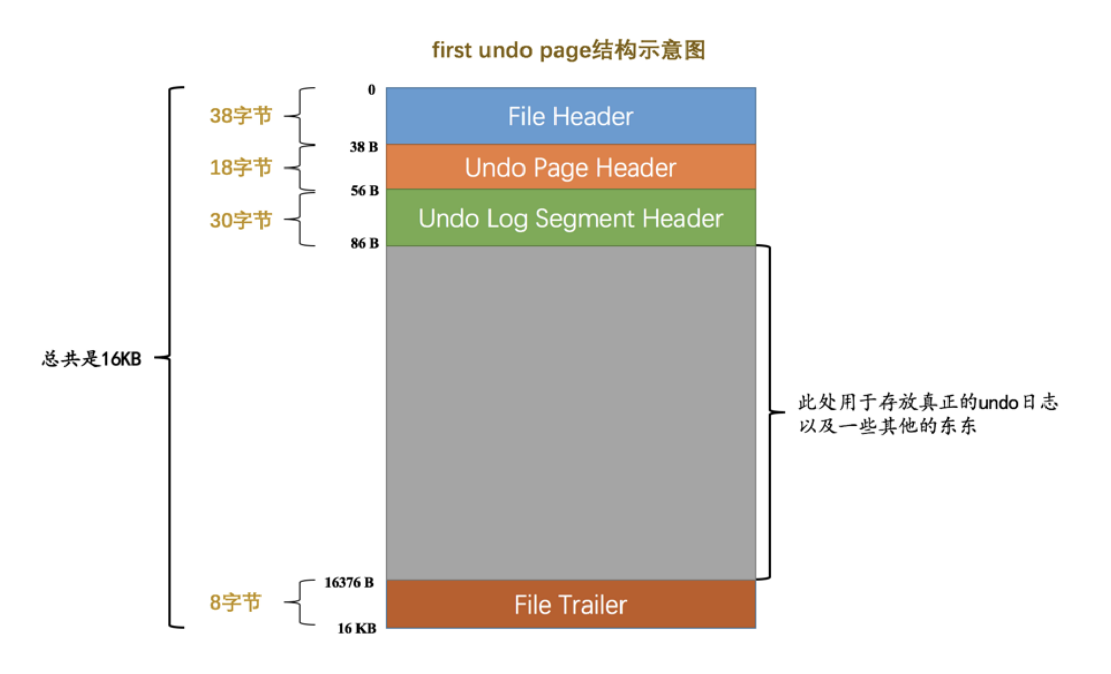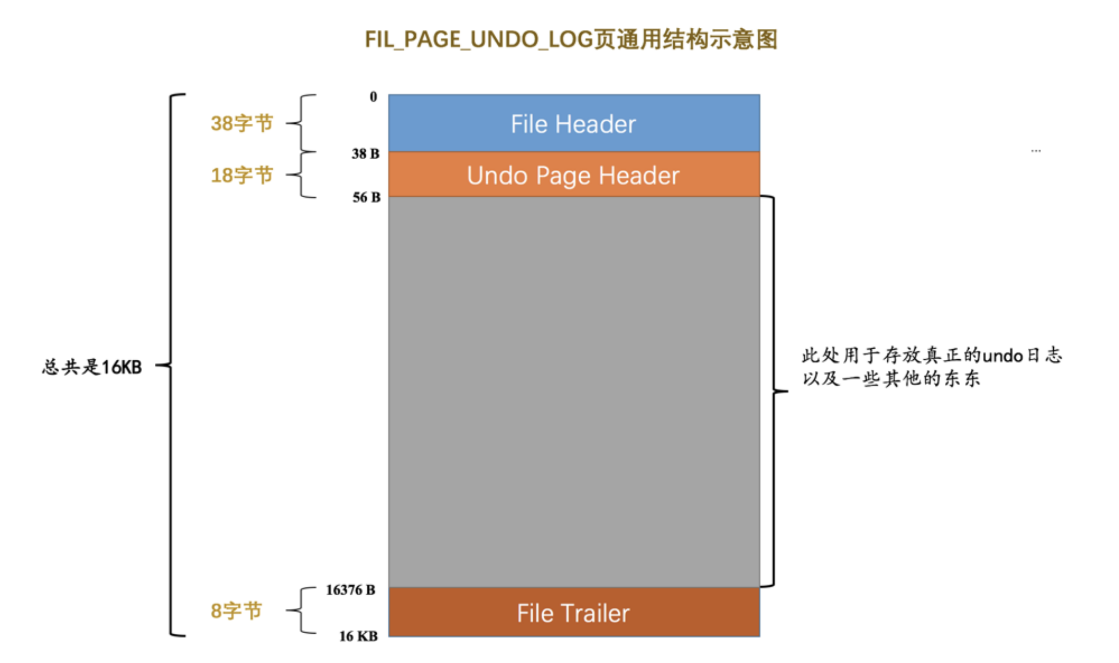 我们前边唠叨表空间的时候说过,表空间其实是由许许多多的页面构成的,页面默认大小为 16KB 。这些页面有不同的类型,比如类型为 FIL_PAGE_INDEX 的页面用于存储聚簇索引以及二级索引,类型为 FIL_PAGE_TYPE_FSP_HDR 的页面用于存储表空间头部信息的,还有其他各种类型的页面,其中有一种称之为 FIL_PAGE_UNDO_LOG 类型的页面是专门用来存储 undo日志 的,这种类型的页面的通用结构如下图所示(以默认的 16KB 大小为例):
