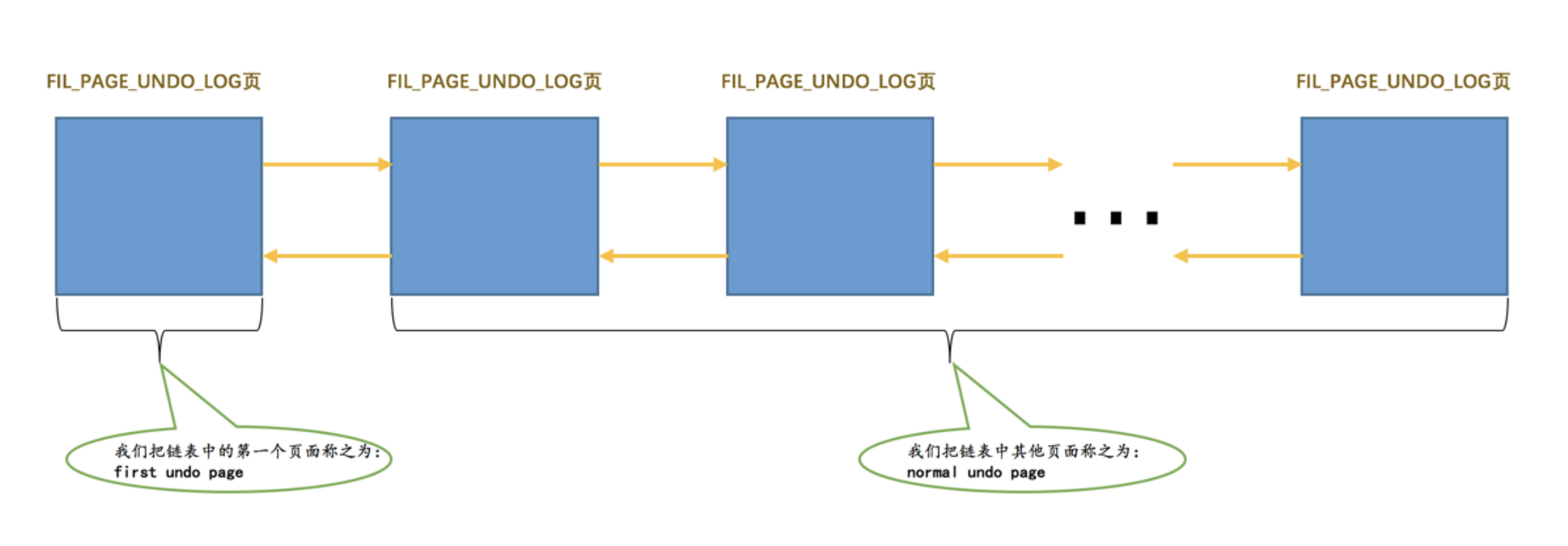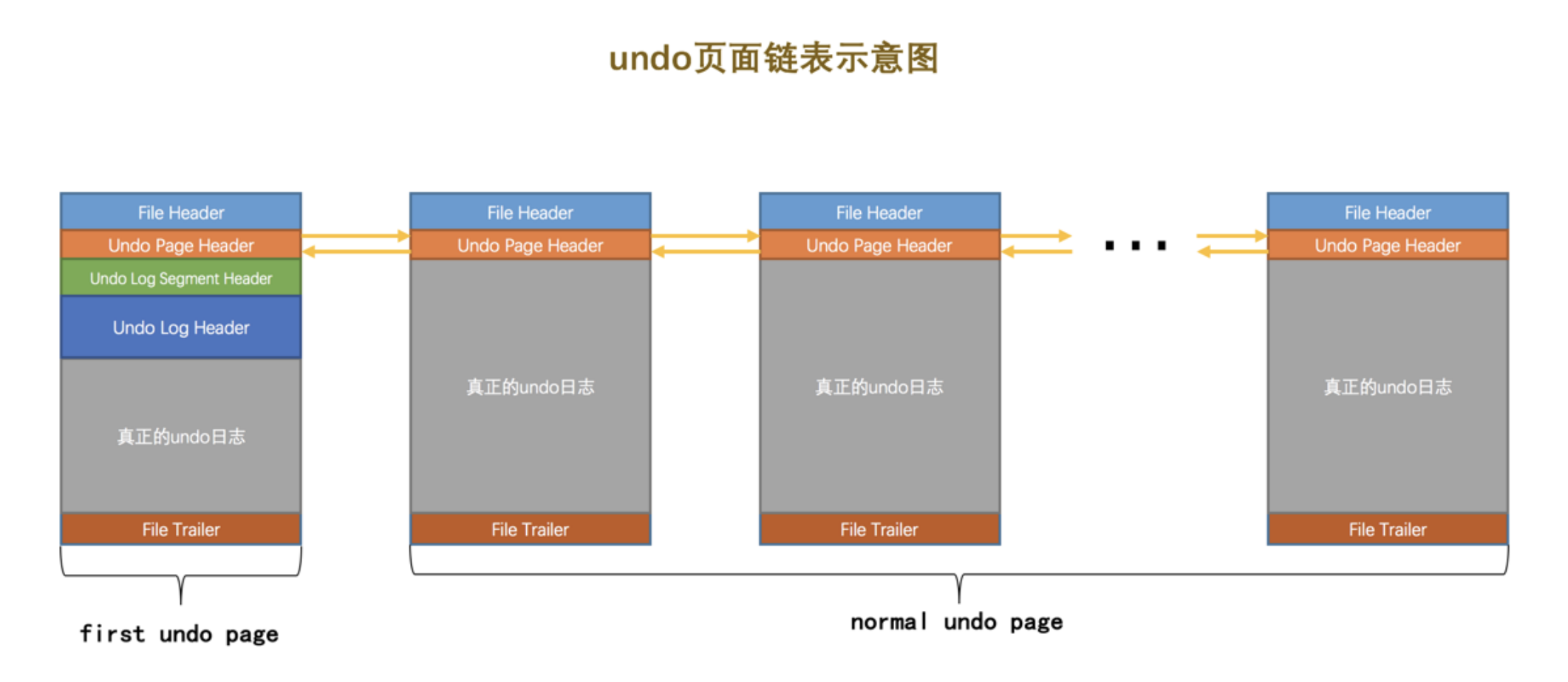 对于没有被重用的 Undo页面 链表来说,链表的第一个页面,也就是 first undo page 在真正写入 undo日志前,会填充 Undo Page Header 、 Undo Log Segment Header 、 Undo Log Header 这3个部分,之后才开始正式写入 undo日志 。对于其他的页面来说,也就是 normal undo page 在真正写入 undo日志 前,只会填充 Undo Page Header 。链表的 List Base Node 存放到 first undo page 的 Undo Log Segment Header 部分, List Node 信息存放到每一个 Undo页面 的 undo Page Header 部分,所以画一个 Undo页面 链表的示意图就是这样: