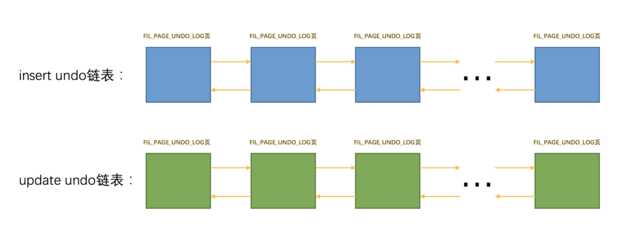 在一个事务执行过程中,可能混着执行 INSERT 、 DELETE 、 UPDATE 语句,也就意味着会产生不同类型的 undo日志 。但是我们前边又强调过,同一个 Undo页面 要么只存储 TRX_UNDO_INSERT 大类的 undo日志 ,要么只存储 TRX_UNDO_UPDATE 大类的 undo日志 ,反正不能混着存,所以在一个事务执行过程中就可能需要2个 Undo页面 的链表,一个称之为 insert undo链表 ,另一个称之为 update undo链表 ,画个示意图就是这样: