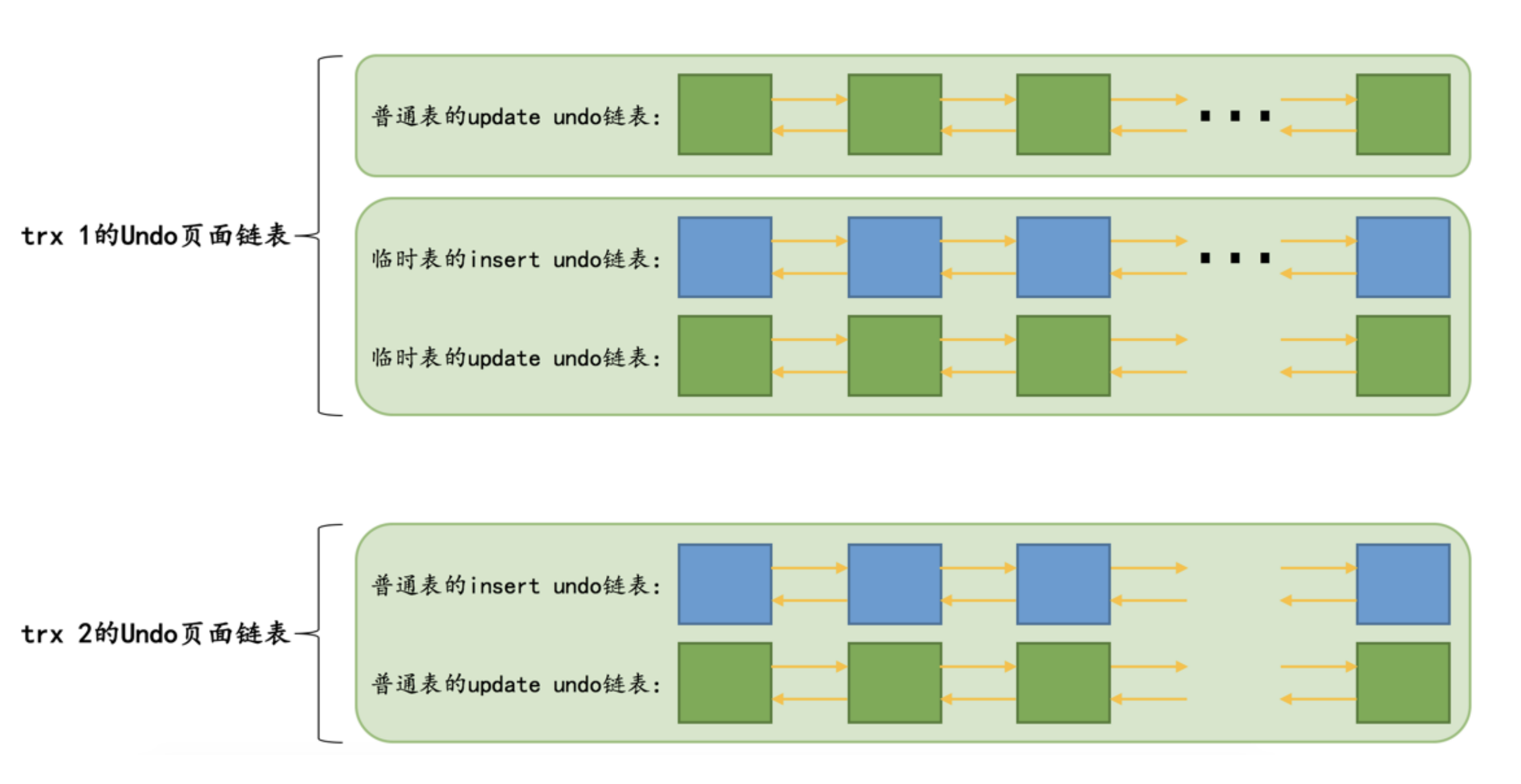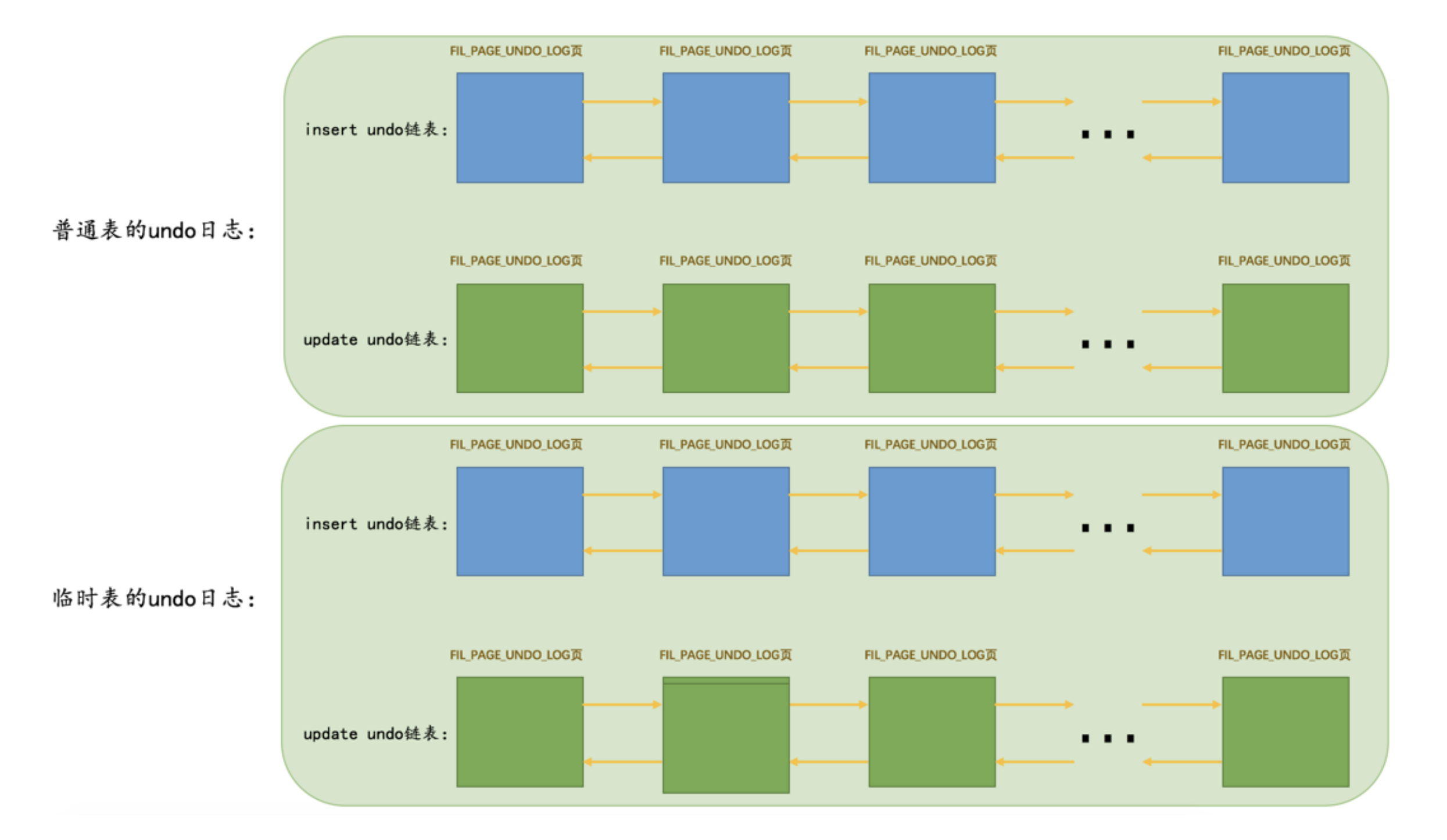 - 当事务执行过程中删除或者更新了临时表中的记录之后,就会为其分配一个 临时表的update undo链表 。