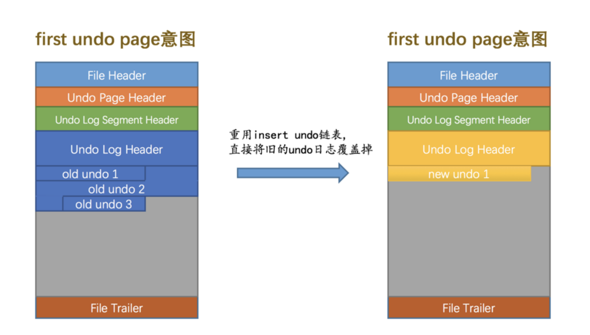 insert undo链表 中只存储类型为 TRX_UNDO_INSERT_REC 的 undo日志 ,这种类型的 undo日志 在事务提交之后就没用了,就可以被清除掉。所以在某个事务提交后,重用这个事务的 insert undo链表 (这个链表中只有一个页面)时,可以直接把之前事务写入的一组 undo日志 覆盖掉,从头开始写入新事务的一组 undo日志 ,如下图所示: