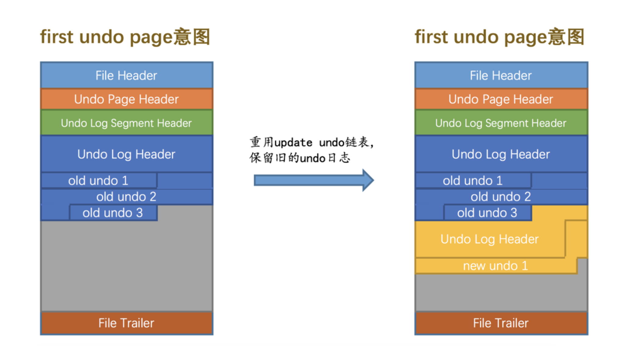 当然,在重用 Undo页面链表写入新的一组 undo日志 时,不仅会写入新的 Undo Log Header,还会适当调整 Undo Page Header、Undo Log Segment Header、Undo Log Header 中的一些属性,比如 TRX_UNDO_PAGE_START、TRX_UNDO_PAGE_FREE 等等等等,这些我们就不具体唠叨了。