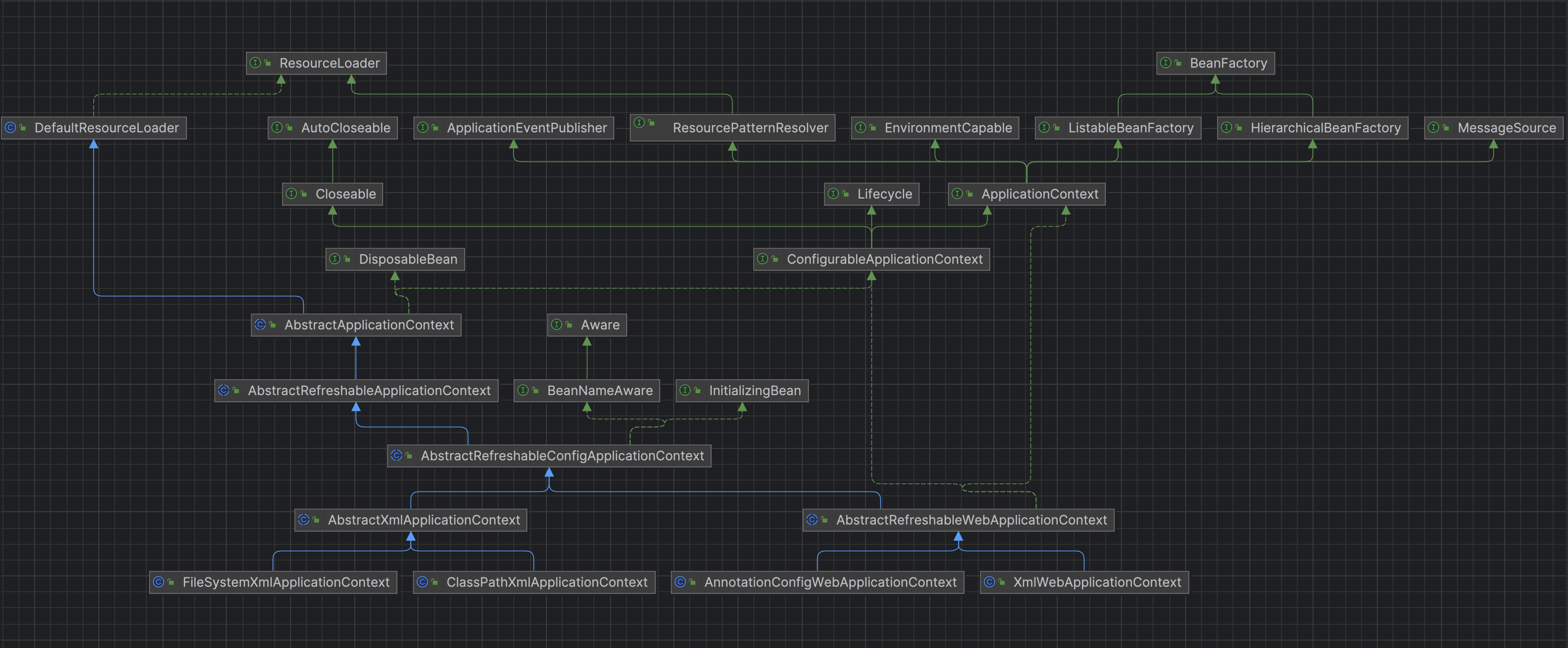 1.)ApplicationContext继承了BeanFactory接口,在内部实现中采用委托的方式调用正真的beanfactory.解析流程 #
