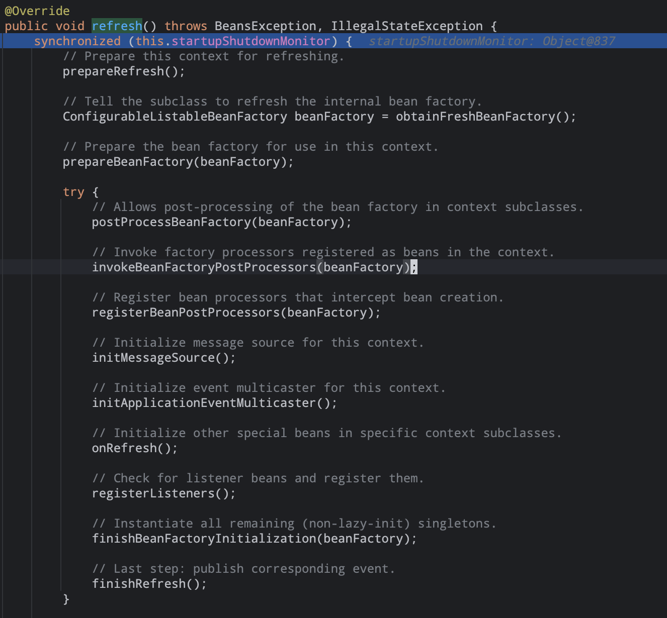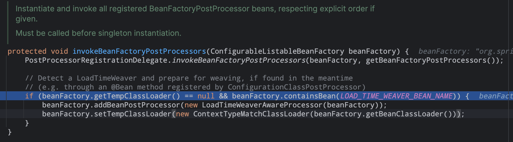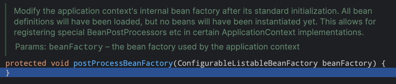 允许子类修改应用上下文中的内部beanfactory在初始化完成之后。所有的beandefinitions已经加载完成,但是并没有实例化。所以此处子类可以适当添加一些bean后置处理器。05). invokeBeanFactoryPostProcessors(beanFactory) #