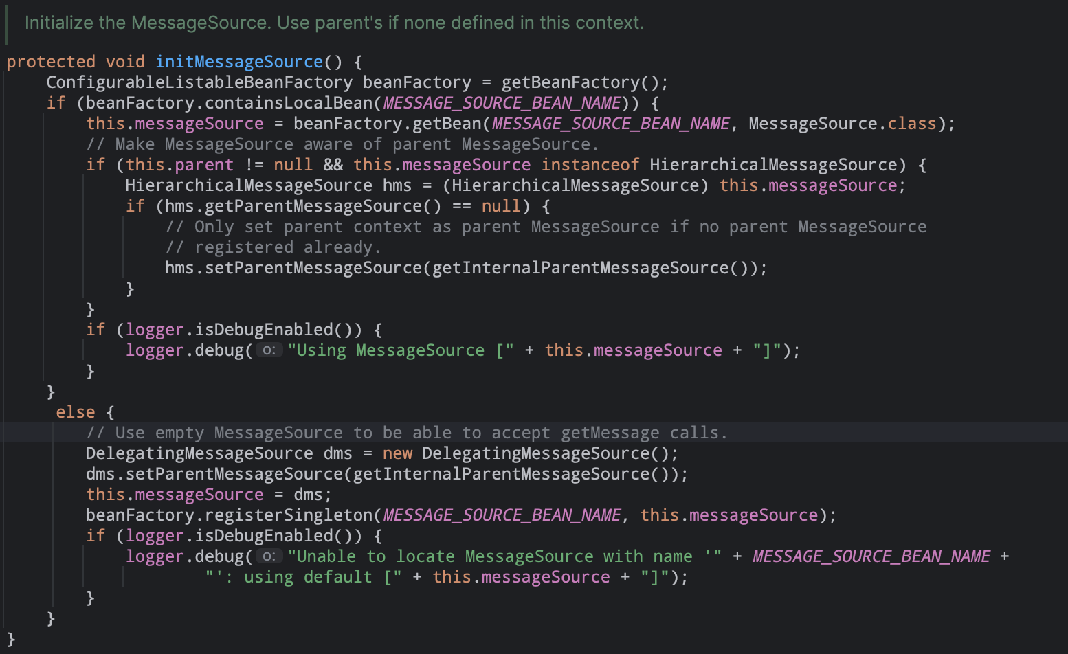 主要用来消息国际化,此处会实例化一个叫MessageSource类型的bean对象(如果配置的话)。 【demo参考】08). initApplicationEventMulticaster() #