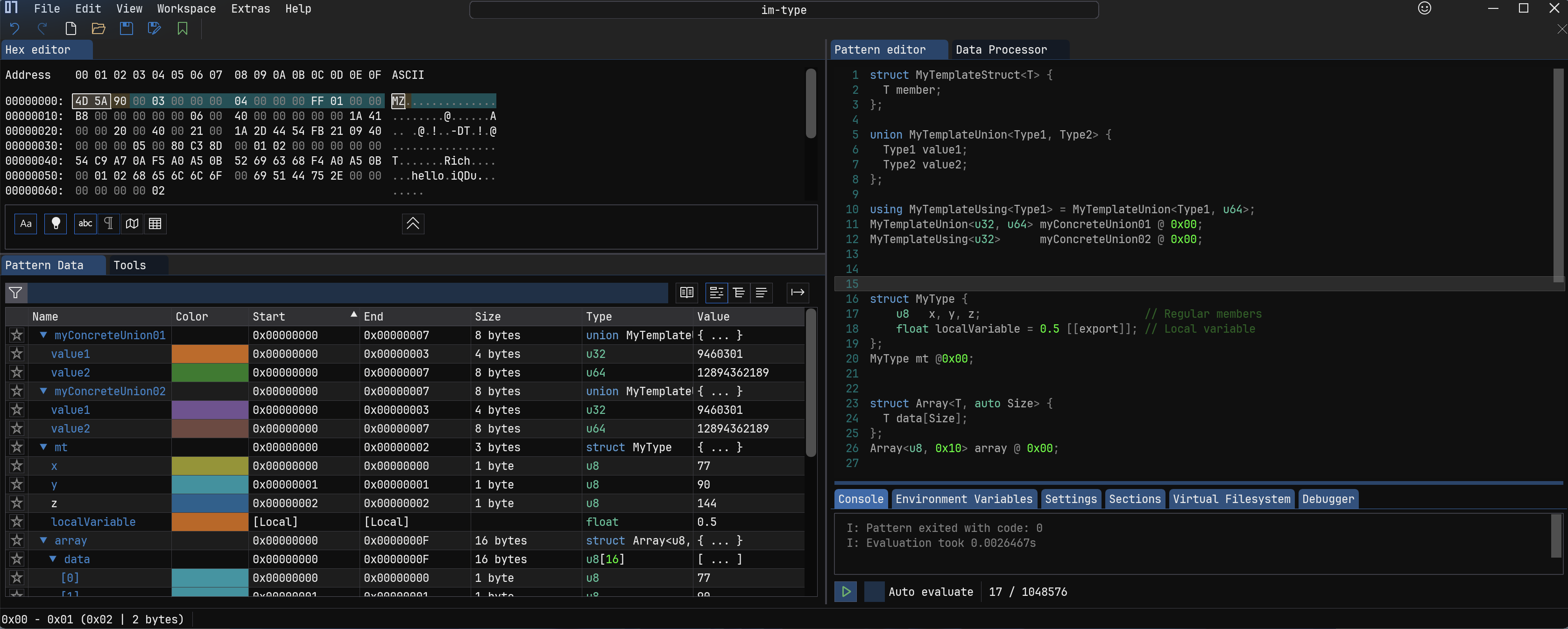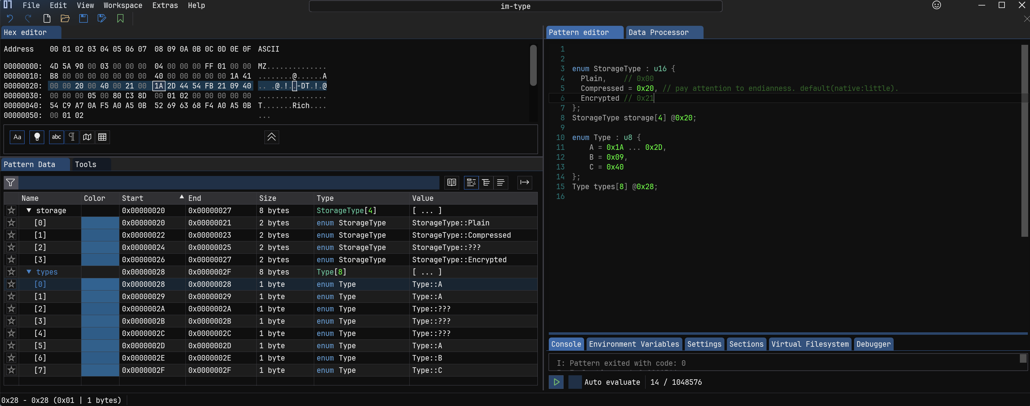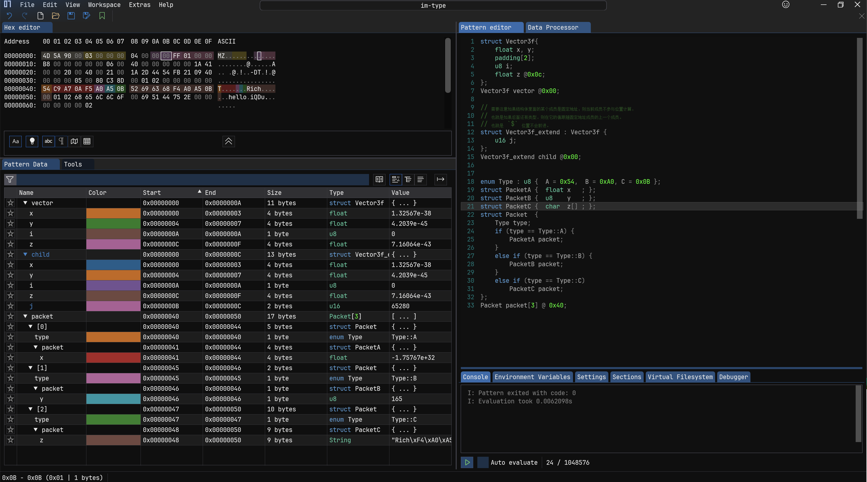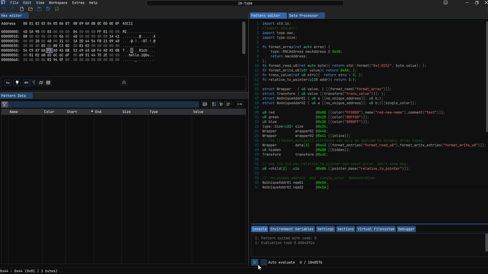 ImHex 的精髓所在。简单的理解,就是通过模式编辑器(Pattern editor),通过编程的方式将二进制文件按照内存地址解析成对应的模式(变量),并通过 Pattern Data 视图窗口将数据展示出来,可以自定义展示数据格式,颜色等,数据布局,格式分布一目了然。类比于 Java POJO中的 toString()。 参考文档